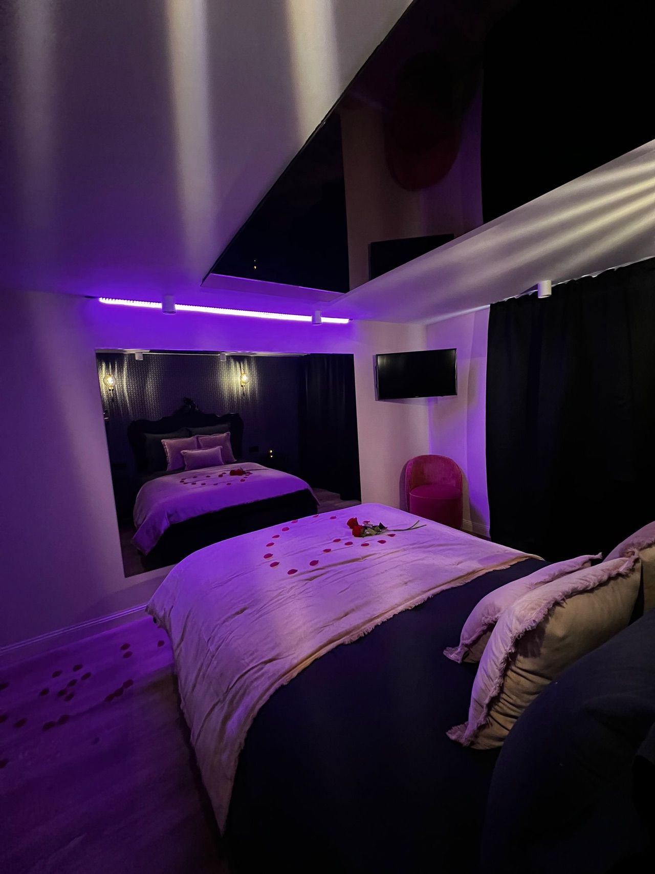 Partagez un moment dans une chambre avec douche, à la déco baroque, avec un grand miroir au mur et au plafond, et un tapis signé Karl Lagerfeld.